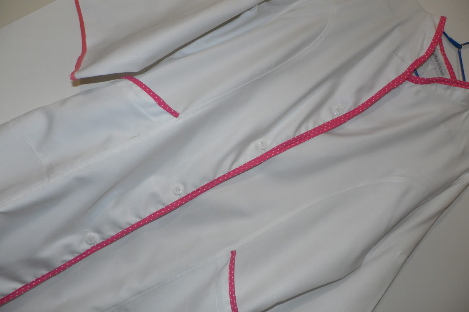 Fazia tempo que queria mudar alguns dos meus jalecos! Fiz o viés com um tecido de algodão e apliquei nos bolsos e nas bordas do jaleco, dando a volta pelo pescoço. Gostei bastante do resultado! Acho que fica com um tom mais alegre do que somente o branco que nós dentistas costumamos usar!